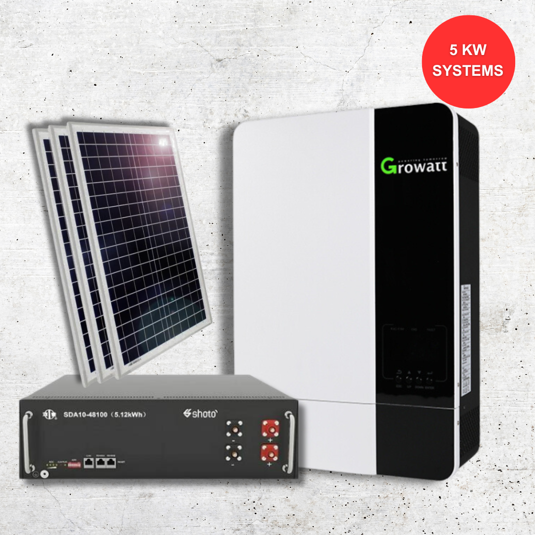 This combo features a 5kW Growatt Inverter, 5.1kWh Shoto Lithium Battery & 6 x 550w JA Mono Solar Panels